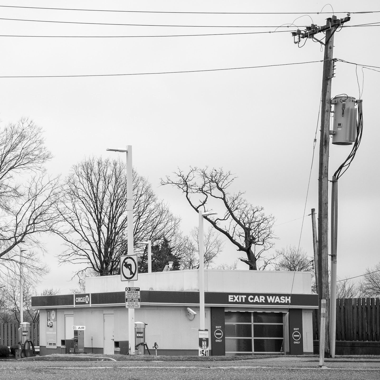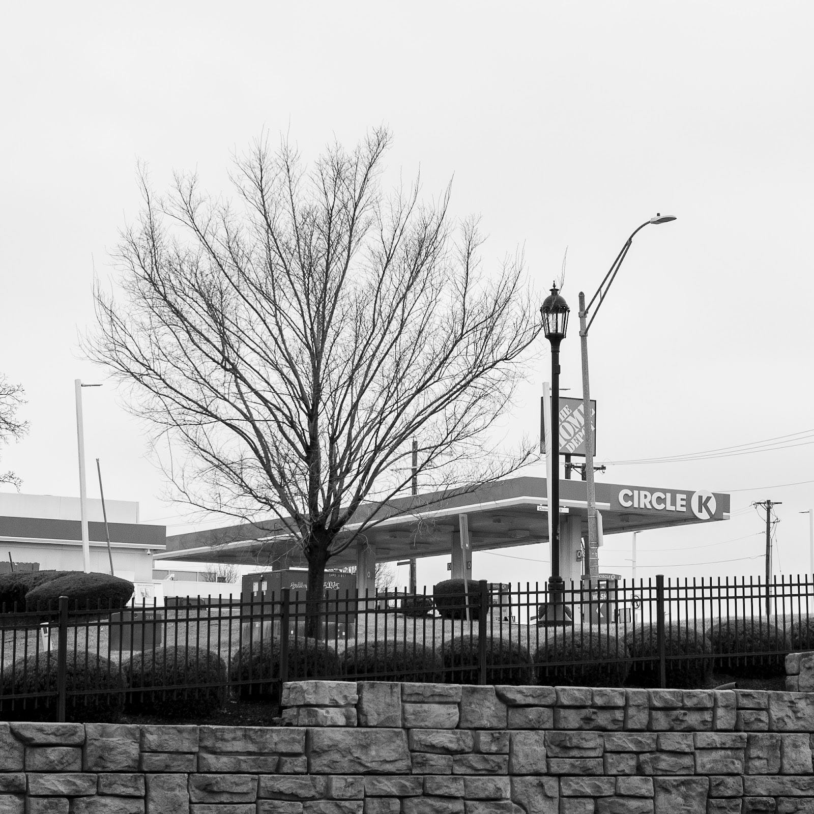 The Circle K offered several photographic opportunities. Here’s another. Again, the sharp edges and flat lines of the building contrast with the “messiness” of the bare trees in the background and the utility pole that blends a little of the two.